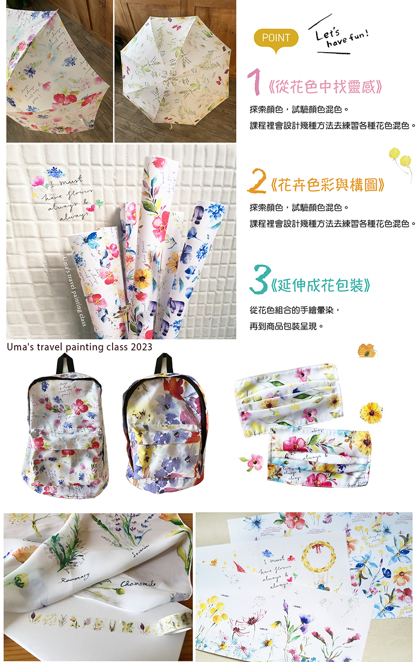 《從花色中找靈感》探索顏色,試驗顏色混色。課程裡會設計幾種方法去練習。
