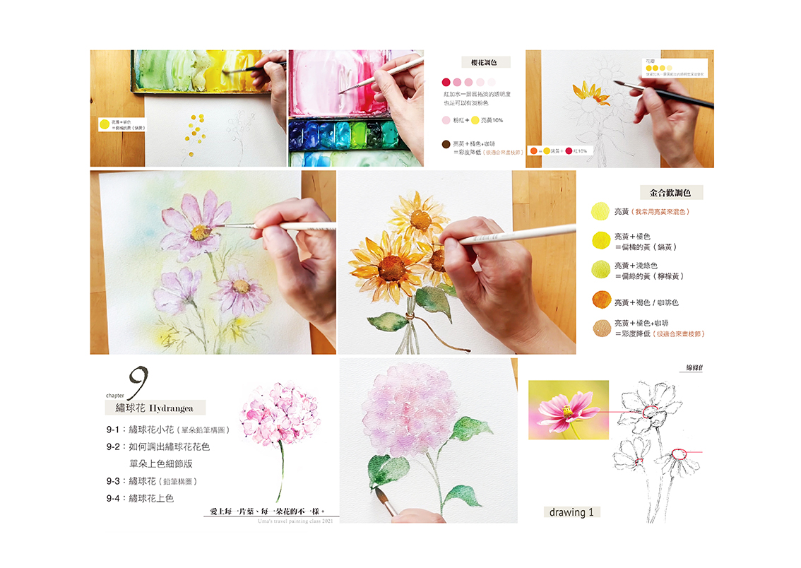 《花卉色彩與構圖》課程裡的花色主題有深入的引導步驟,並讓同學去練習花卉色彩與構圖。
